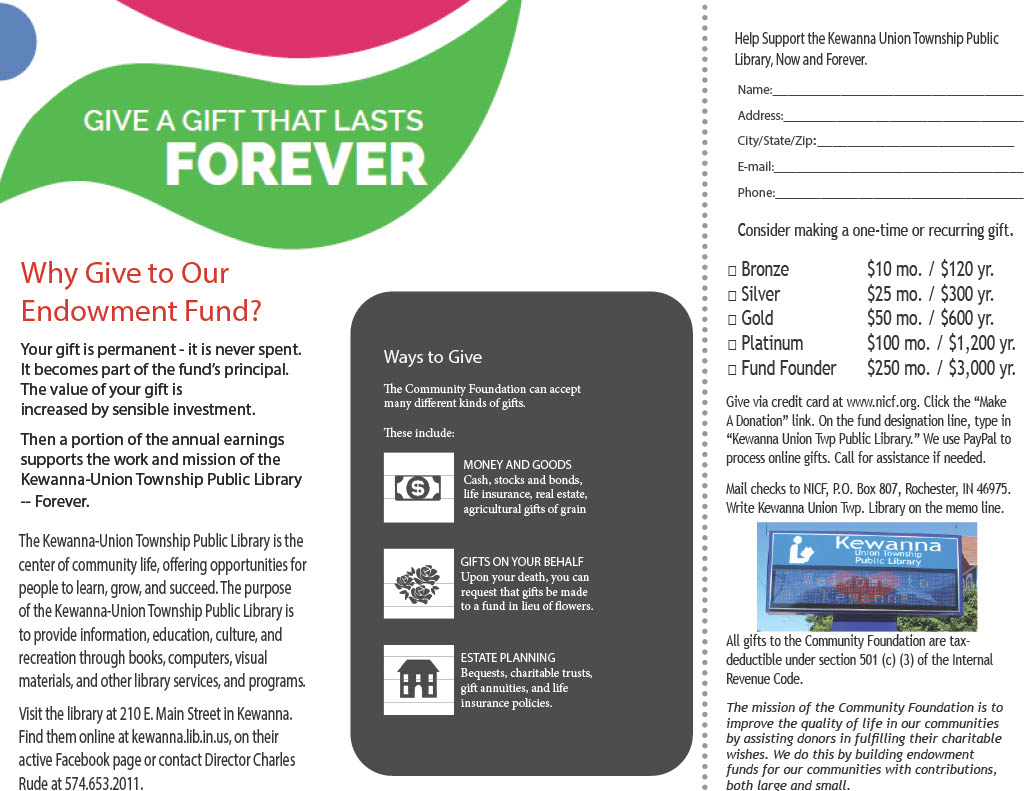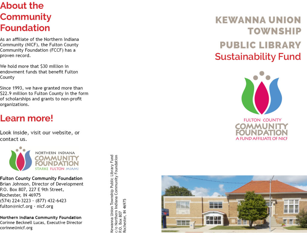 Kewanna Union Township Public Library received the gift in January, and we will use the funds in celebration of the 250th anniversary, to further our mission, and to benefit our community. Our library has put the Kewanna Union Township Public Library part of the Carnegie Grant into our Kewanna Union Township Public Library Sustainability Fund at the Fulton County Community Foundation to continue future growth. If you would like to support our library, the ways to donate are listed in the brochure below.